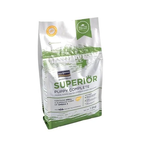 Fish4Dogs Superior Puppy Complete ist ein ausgewogenes Futter für Welpen. Die Brocken enthalten einen hohen Gehalt an Fisch, der reich an leicht verdaulichen Proteinen ist. Der hohe Eiweißgehalt (30%) trägt zur gesunden Entwicklung und Wachstum des jungen Hundes bei. Fisch ist von Natur aus ein wertvoller Lieferant essenzieller Omega-3-Fettsäuren, die unter anderem zur Gesundheit der Haut und des Fells sowie der Entwicklung der Gelenke und des Gehirns beitragen. Das Futter enthält kein Getreide. Als Kohlenhydratquellen werden stattdessen Kartoffeln und Erbsen verwendet. Aus diesem Grund eignen sich die Brocken auch für Welpen, die sensibel für Nahrungsmittelunverträglichkeiten sind.